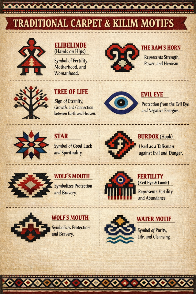 This is the most important human motif in Anatolian weaving. It represents motherhood, fertility, and the “Great Mother” goddess.